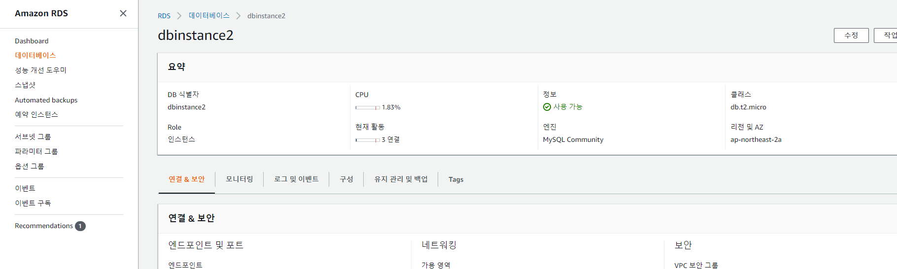 여기서 연결&보안에 퍼블릭 엑세스 가능성을 '예'로 해놔야하는다. (내컴터같은 다른곳에서 aws컴터로 접근할려면) 이건 처음 rds생성할때 옵션이 안보여서 RDS생성 후 위에 사진의 수정버튼을 통해 수정해주었다.