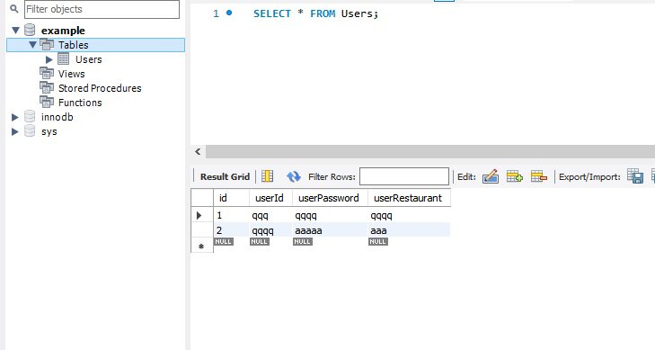 마지막으로 생성 후 데이터베이스를 생성할 때 내가 RDS를 생성했을때의 스키마 이름으로 해야한다. (example)