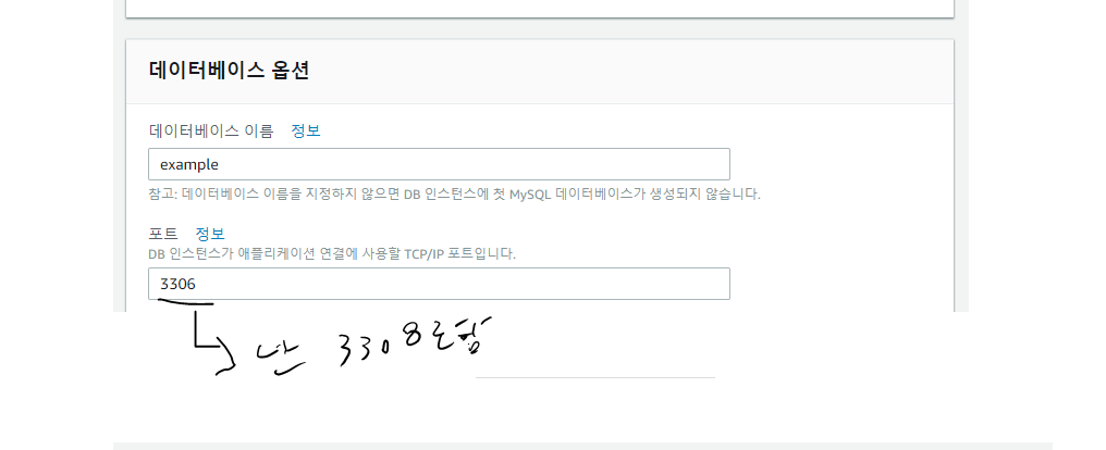참고로 나는 포트번호를 3308로 하고 mysql버전을 8로하였다. 과금안되게 프리티어로 잘 설정하도록하자. 그리고 디비이름과 사용자이름 암호 다 나중에 접속하는데 사용하므로 잘 설정하도록 하자.
