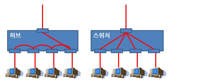 이를 위해서는 T자형 분배기를 만들어야하는데 작업이 번거로우므로 허브(Hub)라는 기기를 사용한다. (허브 안에 T자로 분배된 회선이 있다고 생각한다, 허브에는 케이블 삽입구 즉 포트가 여러개가 있고 이것을 다수의 컴퓨터와 연결할 수 있다. 라우터와도 연결 가능)