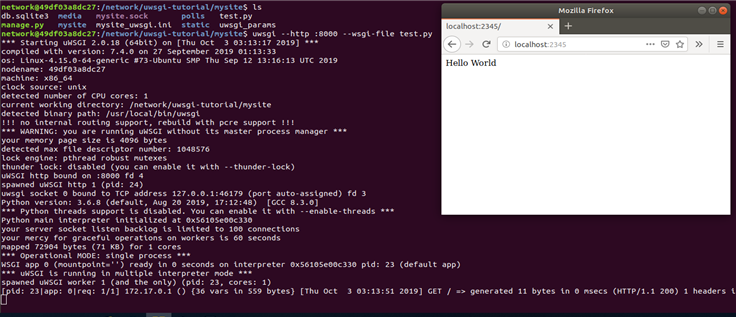이 테스트가 성공함으로써 client – uWsgi- python 간의 동작이 된다는 것을 의미한다. 다음은 test.py 말고 Djano 서버를 실행 및 테스트를 해봤다. 다음과 같이 잘 동작함을 볼 수 있다.