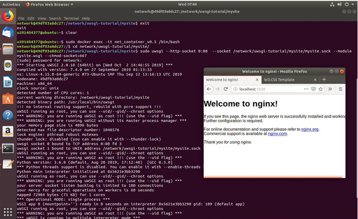 먼저 위와 같이 Dockerfile을 만들어 이미지 생성 후 docker run -it –v /home/u201404377/u201404377/network:/network -p 1234:80 -p 443:443 -p 2345:8000 --name net_container_v0.5 network-class:0.1 /bin/bash 로 도커 컨테이너를 만들었다. 80포트를 1234로 8000포트를 2345로 mapping 시켰다. (포트포워딩 => 내부포트:외부포트)