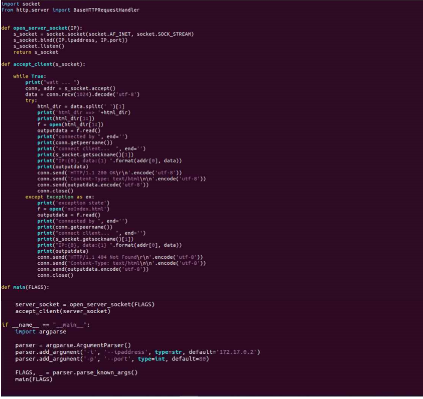기본 ip와 port는 앞서 확인한 도커 컨테이너 ip로 설정하였 다. 그리고 포트는 도커 컨테이너를 만들 때 1234:80 으로 포트포워딩 하였으므로 80으로 설정하였다. open_server_socket 서버를 연 후 클라이언트의 접속에 대기한다.