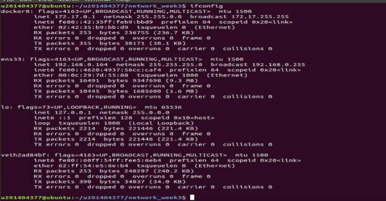 와이파이를 통해서 윈도우 컴퓨터나 외부에서 도커 컨 테이너의 소켓 서버에 접속할 것이므로 클라이언트에 ifconfig 명령어를 통해 ens33 IP를 확인했다.(Bridge) 192.168.0.164임 을 알 수 있다. (뒤에 코드에서 다른 장소에서 한것도 있으므로 ip가 달라진게 있다.)