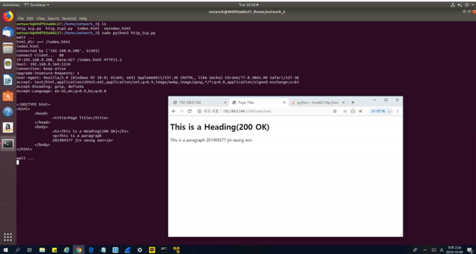 그리고 클라이언트의 접속 요청이 오면 http를 읽어들여 파일 경로를 파싱해준 후 해당 경로의 파일을 open()읽어 들인다. 추가로 String형태로 outputdata에 저장한다. 저는 /index.html만 준비해놨고 다른 경로가 오면 예외처리로 404 코드와 함께 noIndex.html을 불러오게 했다. 조교님의 실행영상에서 출력문이 나왔던 것도 똑같이 출력되게 해주었다. conn.getpeername()으로 연결된 상대(클라이언트) 의 address(주소)를 얻었다. getsocketname() 으로는 포트 번호를 출력시켜주었다. 클라이언트에게 응답을 보내주는 것은 send() 메소드를 통해서 보내주었다. 내용은 HTTP 형식에 맞게 보내주고 요청한 데이 터를 보내주었다. 응답을 보내줄 때는 utf-8로 인코딩해주어 보내줘야한다. 응답 데이터를 클라이언트에게 모두 보내준 후 연결은 close로 끊는다.
