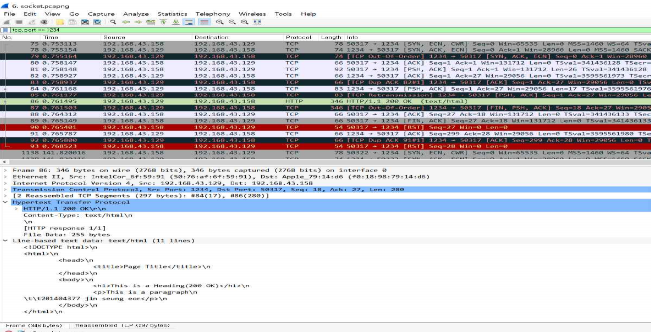 Wireshark의 결과이다. 요청과 응답이 잘 왔음을 볼 수 있다. HTTP 부분을 보면 클라이언트에서 서버로 요청시 GET /index.html HTTP/1.1로 통신했음을 볼 수 있다. 또한 서버 에서 클라이언트로 요청할 때는 요청에 에러사항이 없으므로 200 OK 응답코드와 index.html의 데이터를 보내줌을 볼 수 있다.