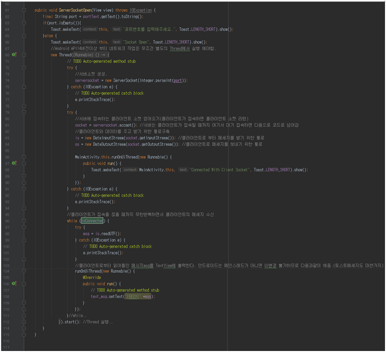 [81~94라인]: accept()로 서버에 접속하는 클라이언트의 소켓을 얻어온다. (클라이언트가 접속할때까지 대기한다.) 그 후 클라이언트가 접속하면 데이터를 주고받기 위한 통로를 DataInputStream과 DataOutputStream으로 구성한다. 또한 클라이언트와 연결되었다고 토스트메세지를 띄워주는데 안드로이드에서는 메인스레드 외에 스레드에서는 UI를 변경하거나 띄워줄수 없기 때문에 runOnUiThread()를 사용해줘야 한다.