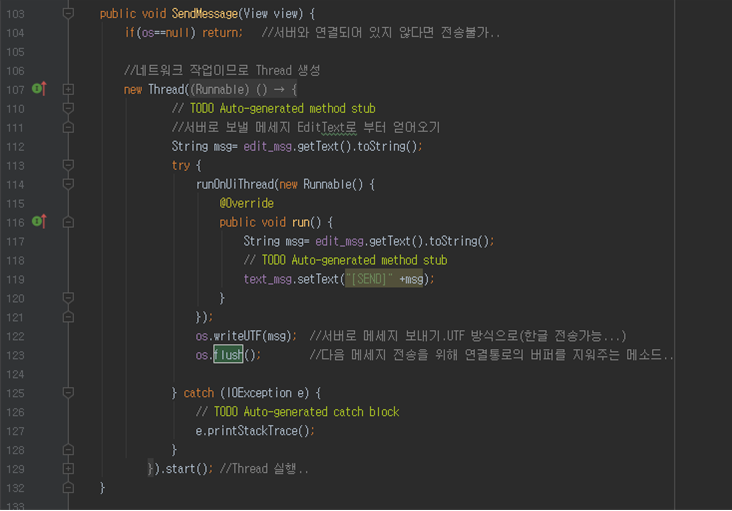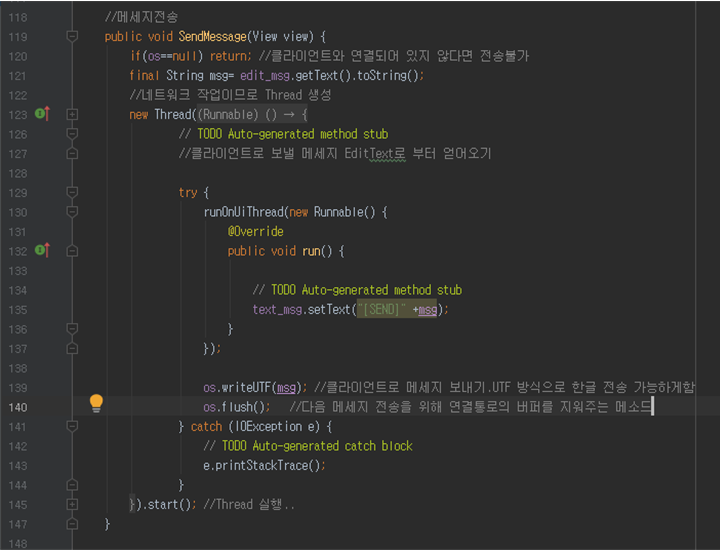 [123~145라인]: 전송할 메시지를 갖고온 후 소켓 통신 즉 네트워크 통신을 해야 하므로 스레드가 사용된다. DataOutputStream 객체의 writeUTF를 통해 메시지를 보내준다. 그리고 다음 메시지 전송을 위해 DataOutputStream 연결통로의 버퍼를 flush()로 지워준다. 송신한 메시지를 자신의 폰에서 볼 수 있게 setText() 해준다. 이것도 UI를 건드는 작업이므로 runOnUiThread()를 이용한다.
