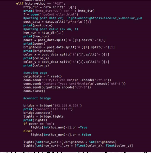 클라이언트에서 서빙된 웹페이지 post 방식의 form 태그를 통해 post 요청을 하면 서버에서 위와 같이 받는다. 전달된 데이터를 파싱하여 전구의 번호 (hue_num), 전원(power), 밝기(brightness), 컬러값(color_x, color_y) 에 저 장한다. 그리고 Bridge 통신을 하여 받은 값을 이용해 전구를 제어한다. lights 안에는 휴 전구 리스트가 들어있다.