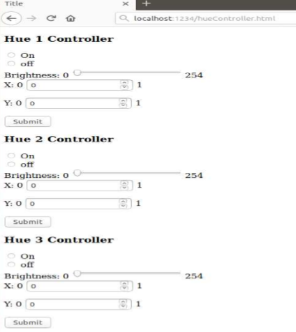 위는 전구를 제어하는 웹페이지인 hueController.html 파일이다. (실수로 head태그에 다 작성했다) form 태그는 post 방식으로 하였고 전원 on/off, 밝기 그리고 x, y 컬러값을 설정할 수 있다. 그리고 총 3개의 전구를 제어할 수 있다.