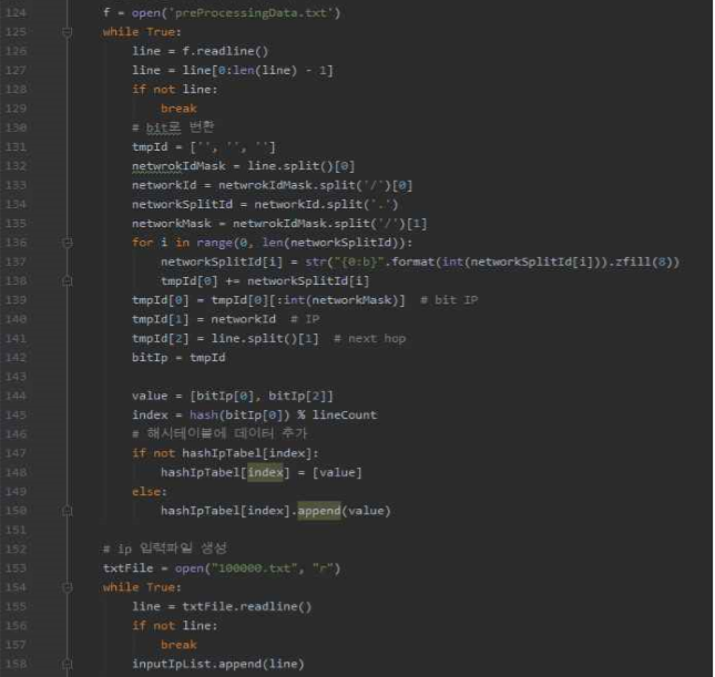 2. 전처리된 파일을 읽어 Hash와 Trie 두 가지 알고리즘을 사용하여 input IP(입력된 ip)의 주소를 탐색하는 방법을 구현 한다.