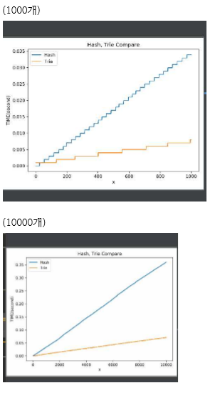 10개일 때 빼고 Trie가 우수함을 알 수 있다. 입력데이터 100000개를 기준으로 실험하였다. Hash 탐색 시간 복잡도 : O(1) Trie 탐색 시간 복잡도 : O(m), m은 탐색하려는 문자열 길이이다.