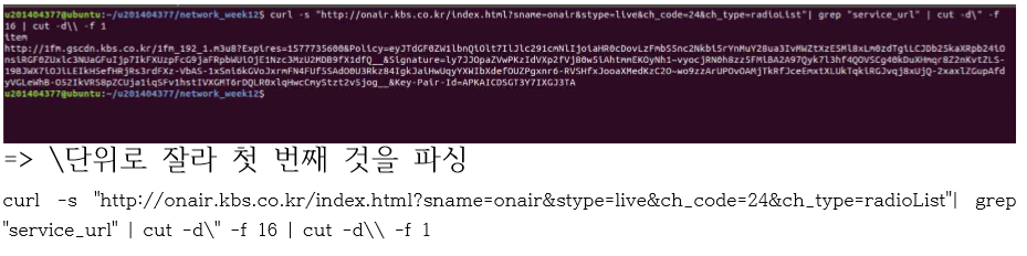 결론적으로 사용한 코드 => $(curl -s "http://onair.kbs.co.kr/index.html?sname=onair&stype=live&ch_code=24&ch_type=radioList"| grep "service_url" | cut -d\" -f 16 | cut -d\\ -f 1) -ao pcm:file= your/path/file_name.flv -vc dummy – vo null