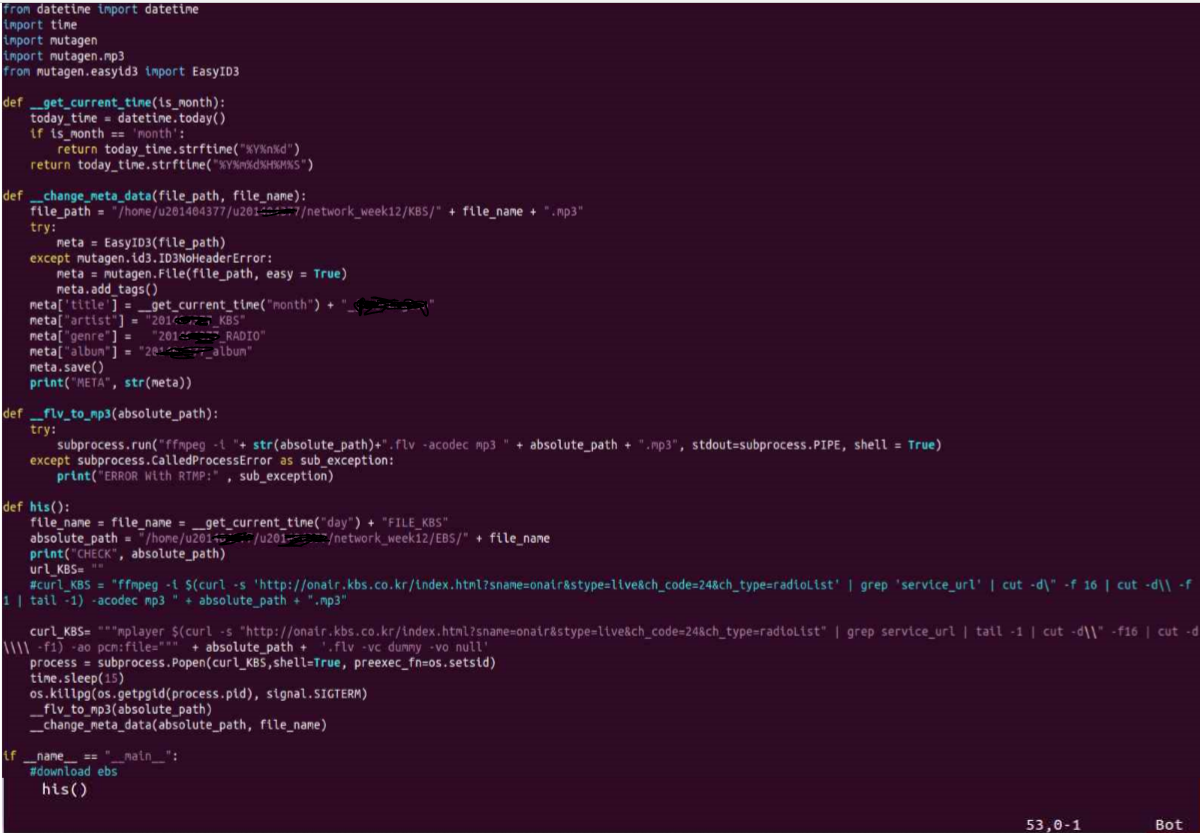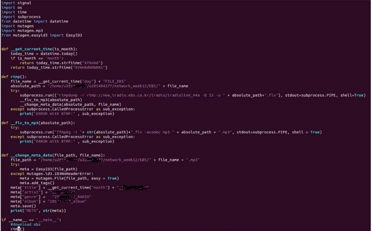 먼저 EBS와 KBS 둘 다 다운 받는 디렉토리를 .../EBS 로 하였다. rtmp()는 rtmp 프로토콜을 사용하여 EBS 라디오를 다운 받는 코드이다. subprocess를 사용하여 rtmpdump 명령어를 실행하고 15초 길이만큼 .flv 포맷으로 다운받는다.