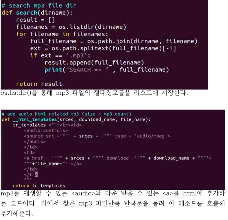 TCP 소켓을 사용한 HTTP 서버를 만들고 클라이언트에게 다운받은 mp3을 다운 및 재생 할 수 있는 웹페이지를 응답해준다.