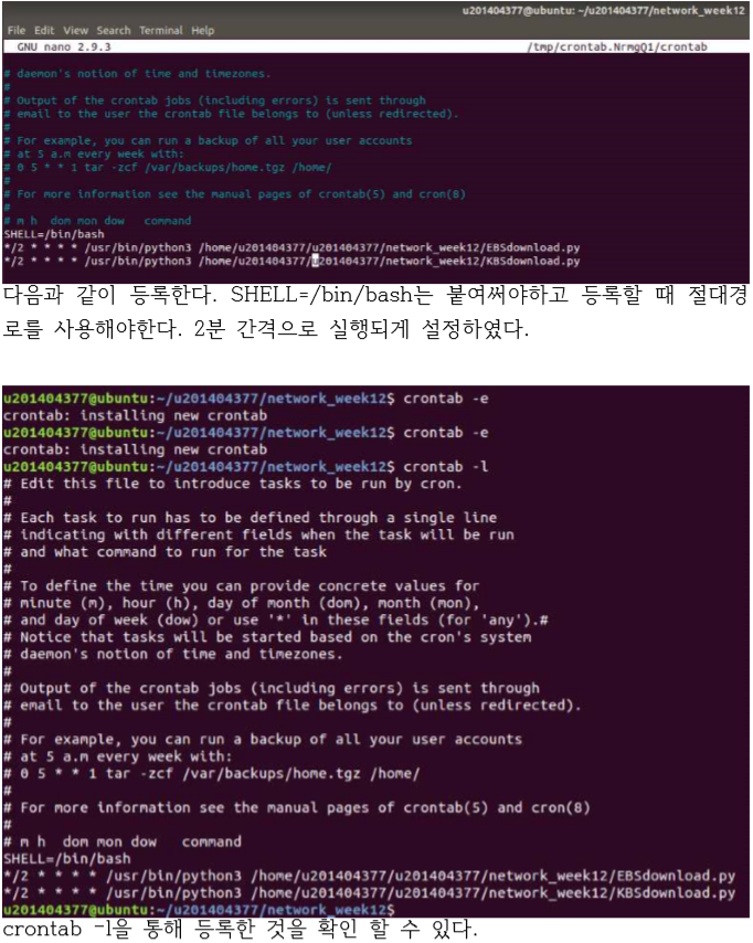 crontab을 사용해서 프로그램 실행을 스케줄링(예약) 할 수 있다. crontab을 통해 내가 만든 EBS, KBS download.py를 주기적으로 실행시키게 하여 mp3 파일을 다운 받게 해보았다.