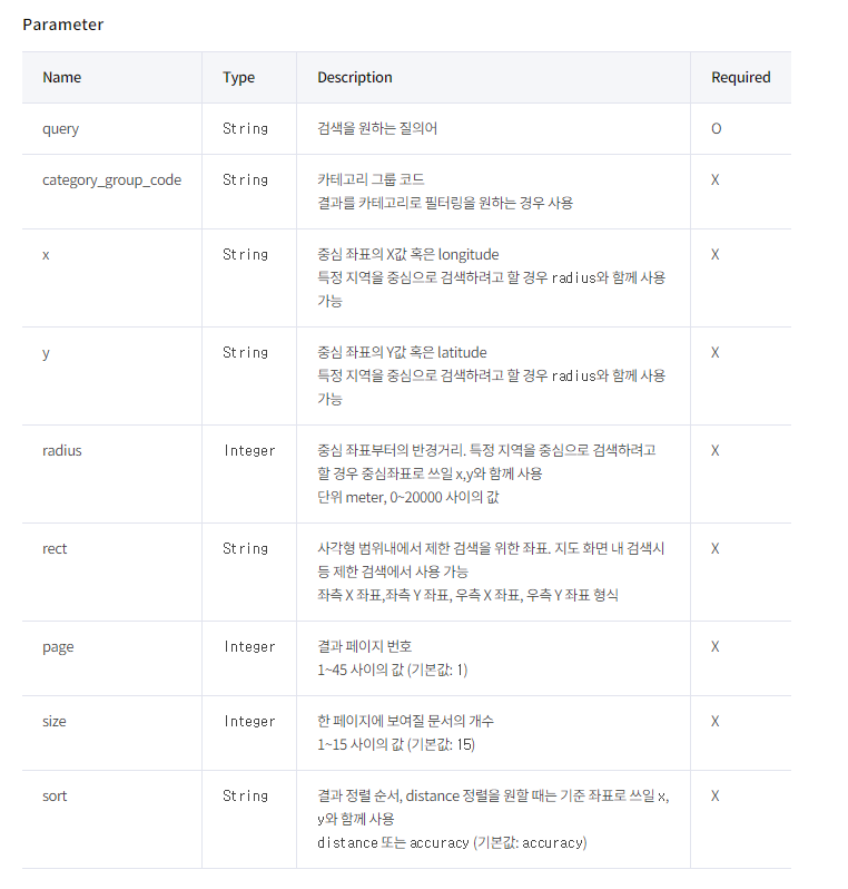 카카오맵 REST API 문서 (단순 SDK 이용이 아닌 Retrofit2 통신이 필요한 부분들 ex. 장소 카테고리, 이름, 주소로 검색 )