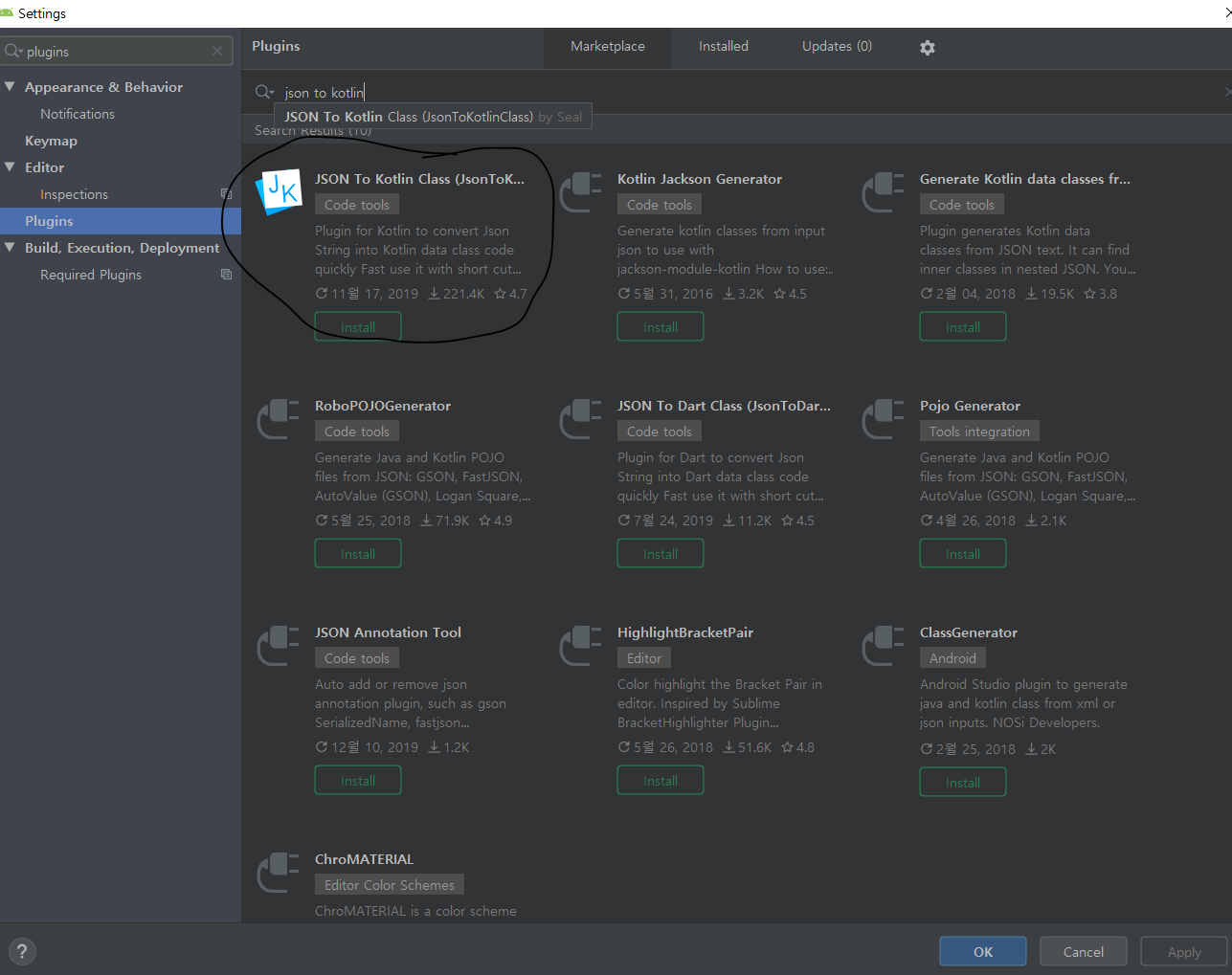 1. 플러그인에서 json to kotlin을 검색하여 위 사진의 플러그인을 다운 받도록 한다.