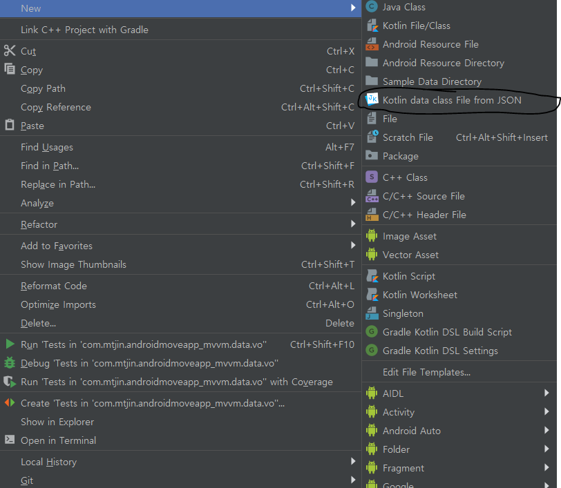3. 프로젝트 우클릭 하고 new 탭 누르면 위와 같이 kotlin data class file from Json이라는게 생긴것을 볼 수 있다.