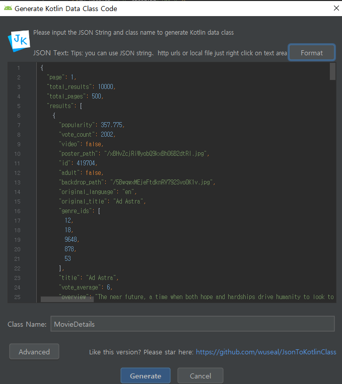 [안드로이드] json to kotlin data class ( json을 코틀린 data class 로 변환해주는 플러그인) 본문
