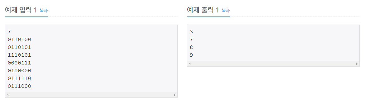 <그림 1>과 같이 정사각형 모양의 지도가 있다. 1은 집이 있는 곳을, 0은 집이 없는 곳을 나타낸다. 철수는 이 지도를 가지고 연결된 집들의 모임인 단지를 정의하고, 단지에 번호를 붙이려 한다. 여기서 연결되었다는 것은 어떤 집이 좌우, 혹은 아래위로 다른 집이 있는 경우를 말한다. 대각선상에 집이 있는 경우는 연결된 것이 아니다. <그림 2>는 <그림 1>을 단지별로 번호를 붙인 것이다. 지도를 입력하여 단지수를 출력하고, 각 단지에 속하는 집의 수