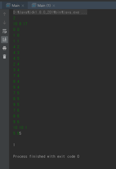 금방 풀었는데 이상한 인텔리제이에서 입력값을 받을 때 버퍼문제인지 아직도 잘 모르겠지만 다음과 같이 엔터를 한번 더눌러야 다음 결과 값이 나오는(?) 이상한 에러가 발생했다.