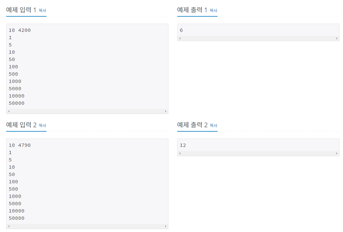 첫째 줄에 N과 K가 주어진다. (1 ≤ N ≤ 10, 1 ≤ K ≤ 100,000,000) 둘째 줄부터 N개의 줄에 동전의 가치 Ai가 오름차순으로 주어진다. (1 ≤ Ai ≤ 1,000,000, A1 = 1, i ≥ 2인 경우에 Ai는 Ai-1의 배수)