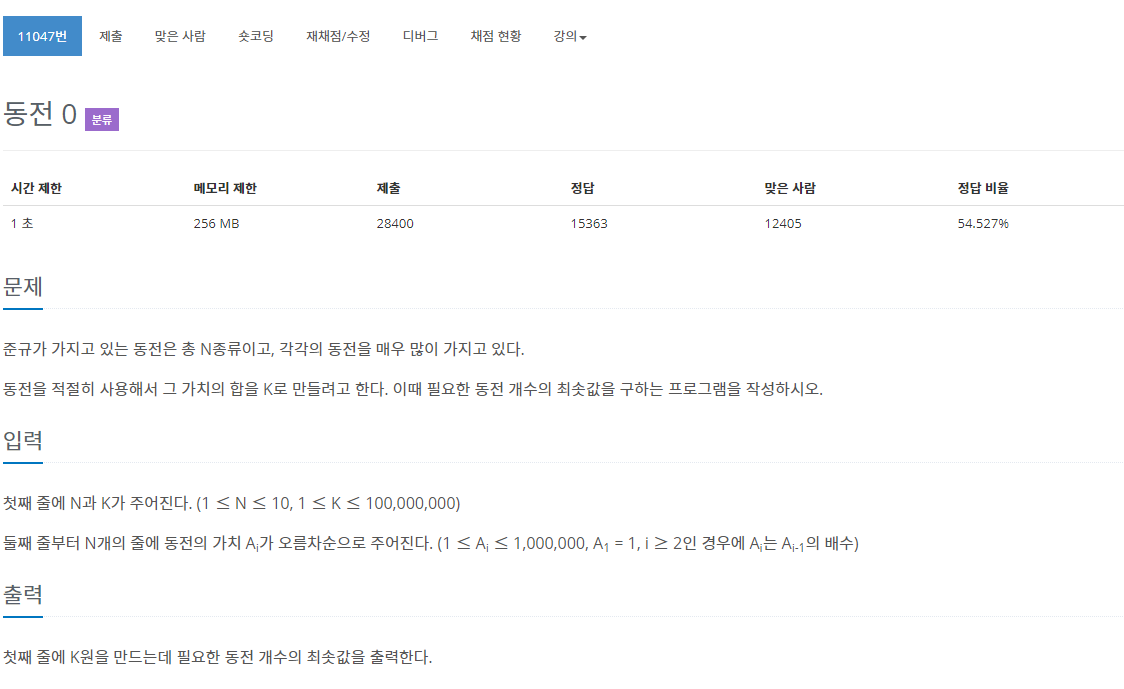 [알고리즘] 백준 11047 동전 0 -그리디- 본문