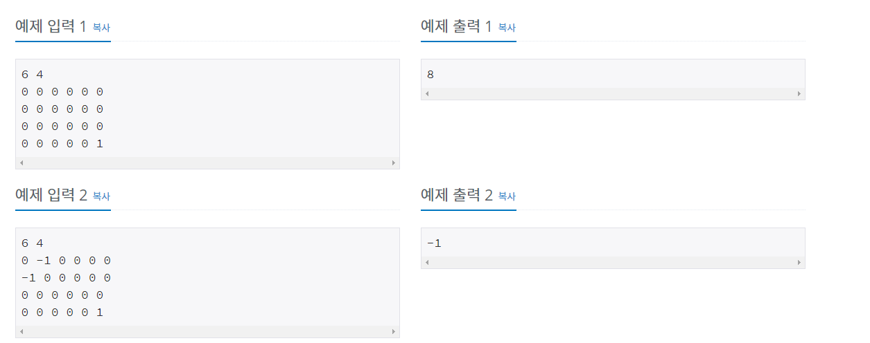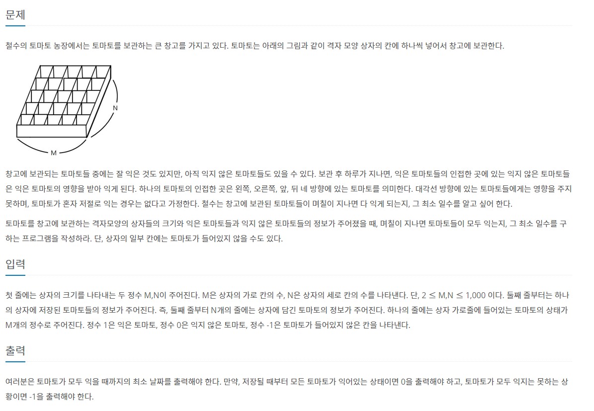 첫 줄에는 상자의 크기를 나타내는 두 정수 M,N이 주어진다. M은 상자의 가로 칸의 수, N은 상자의 세로 칸의 수를 나타낸다. 단, 2 ≤ M,N ≤ 1,000 이다. 둘째 줄부터는 하나의 상자에 저장된 토마토들의 정보가 주어진다. 즉, 둘째 줄부터 N개의 줄에는 상자에 담긴 토마토의 정보가 주어진다. 하나의 줄에는 상자 가로줄에 들어있는 토마토의 상태가 M개의 정수로 주어진다. 정수 1은 익은 토마토, 정수 0은 익지 않은 토마토, 정수 -1은 토마