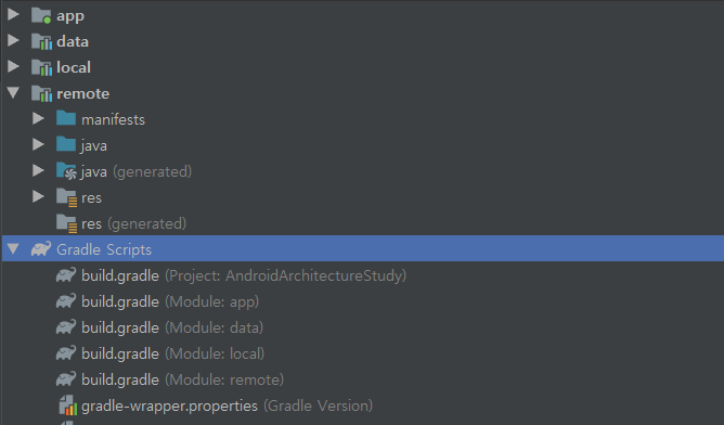 local, remote 모듈이 data 모듈을 물고 있다. (local, remote module 은 data 만 위 처럼 디펜던시 추가해주면 된다.)