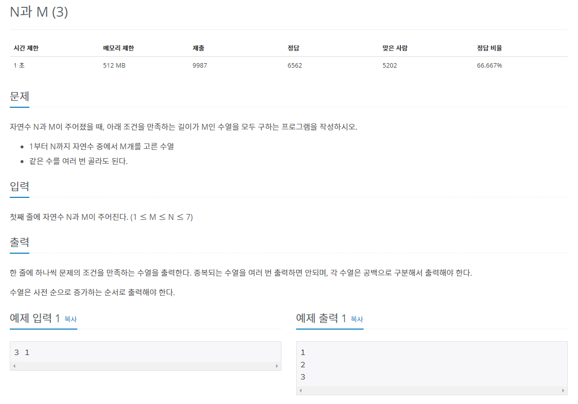 15651번: N과 M (3)