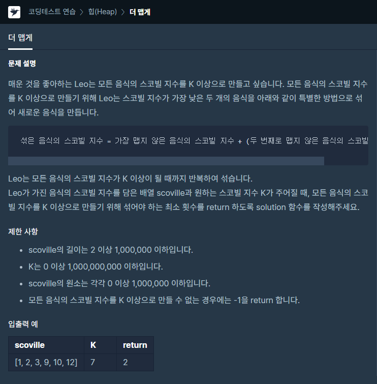 [알고리즘] 프로그래머스 더 맵게 -힙(heap)- 본문