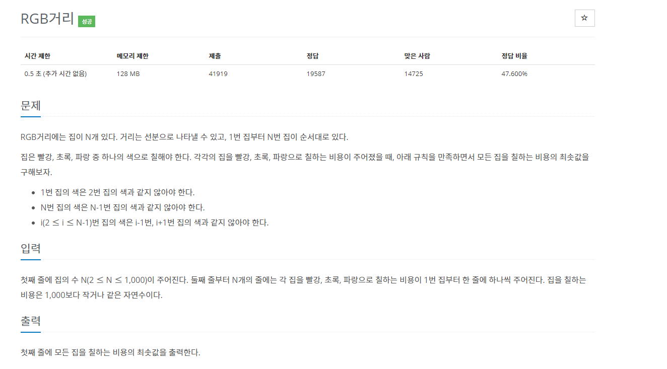 집을 R G B 의 색으로 칠할 수 있는데 연속된 색으로 칠하면 안되고 최소비용을 구해야합니다.