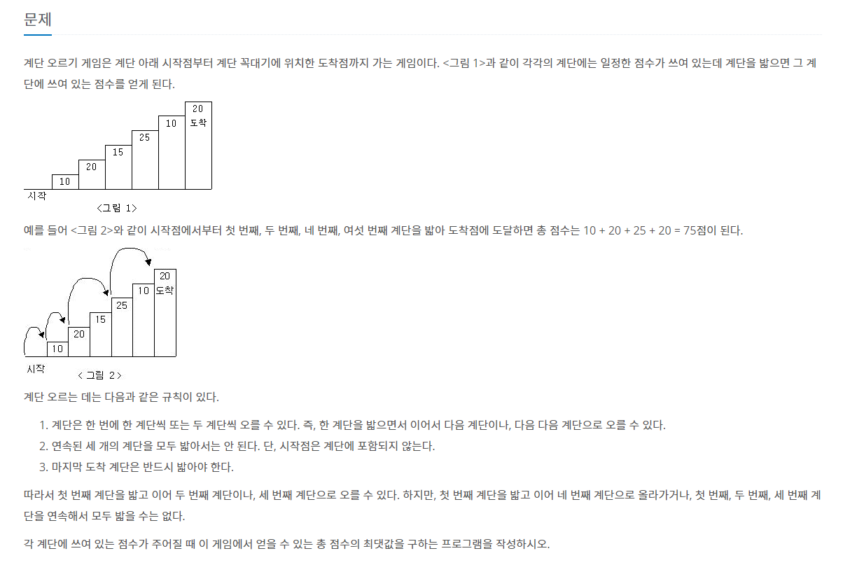 계단 오르기 게임은 계단 아래 시작점부터 계단 꼭대기에 위치한 도착점까지 가는 게임이다. <그림 1>과 같이 각각의 계단에는 일정한 점수가 쓰여 있는데 계단을 밟으면 그 계단에 쓰여 있는 점수를 얻게 된다. 예를 들어 <그림 2>와 같이 시작점에서부터 첫 번째, 두 번째, 네 번째, 여섯 번째 계단을 밟아 도착점에 도달하면 총 점수는 10 + 20 + 25 + 20 = 75점이 된다. 계단 오르는 데는 다음과 같은 규칙이 있다. 계단은 한 번에 한 계단씩