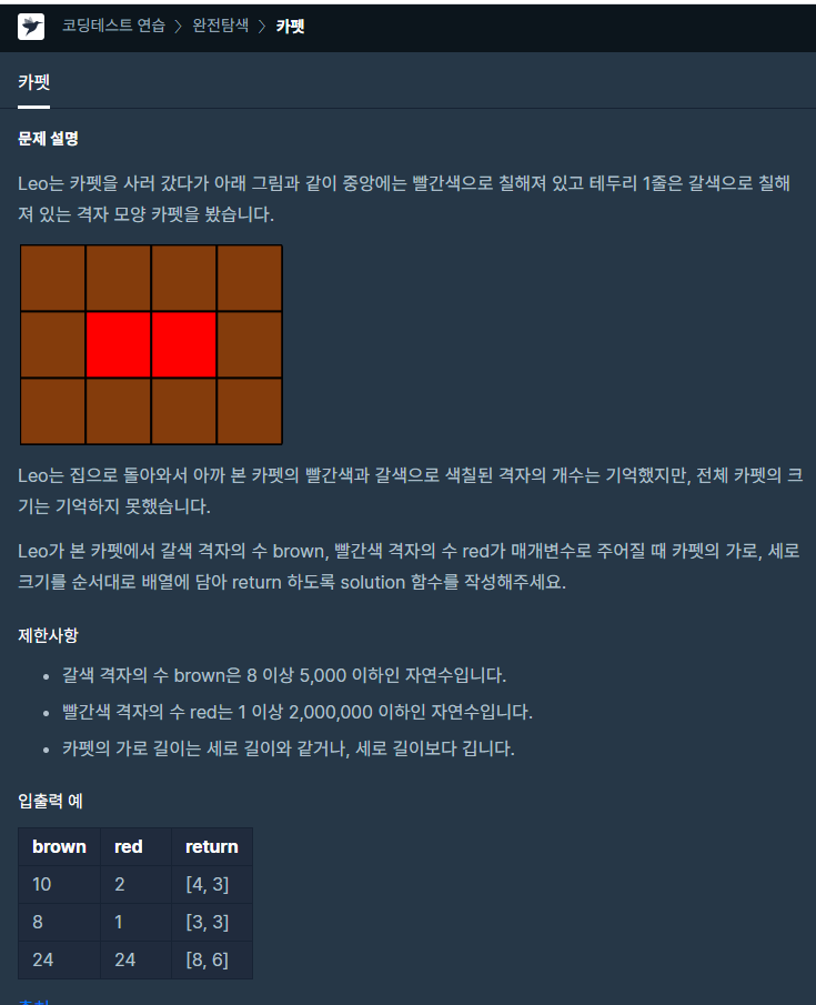 [알고리즘] 프로그래머스 카펫 -완전탐색- 본문
