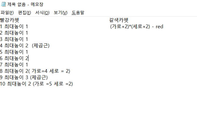 이렇게 분기처리한 후 [전체넓이 - 레드카펫전체개수 = 브라운카펫전체개수] 인지 체크해서 맞다면 그게 답이 됩니다.