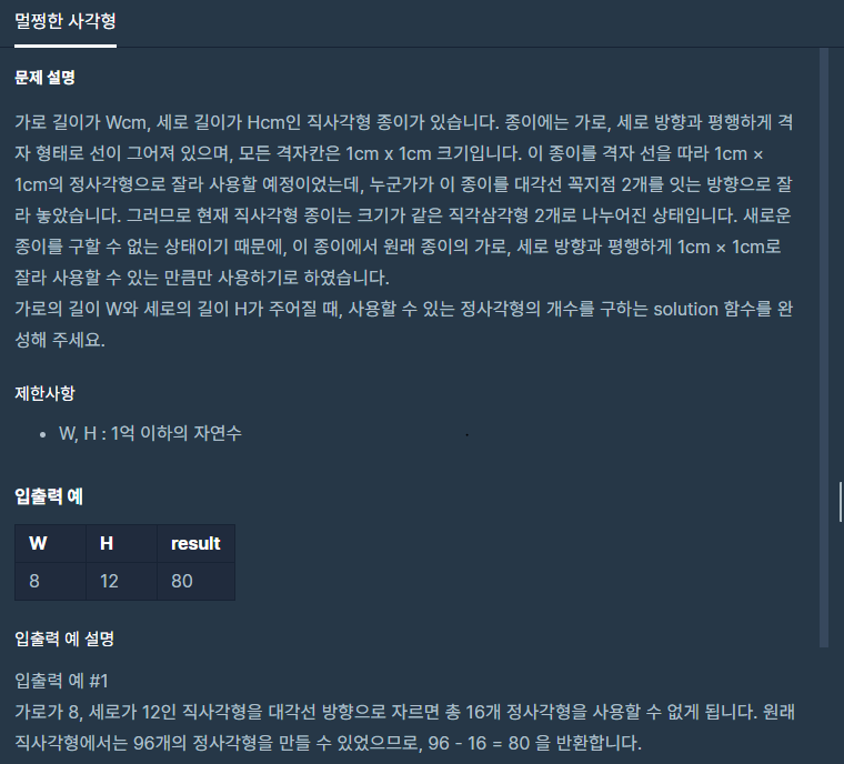 프로그래머스 멀쩡한 사각형이라는 문제를 풀어봤습니다.