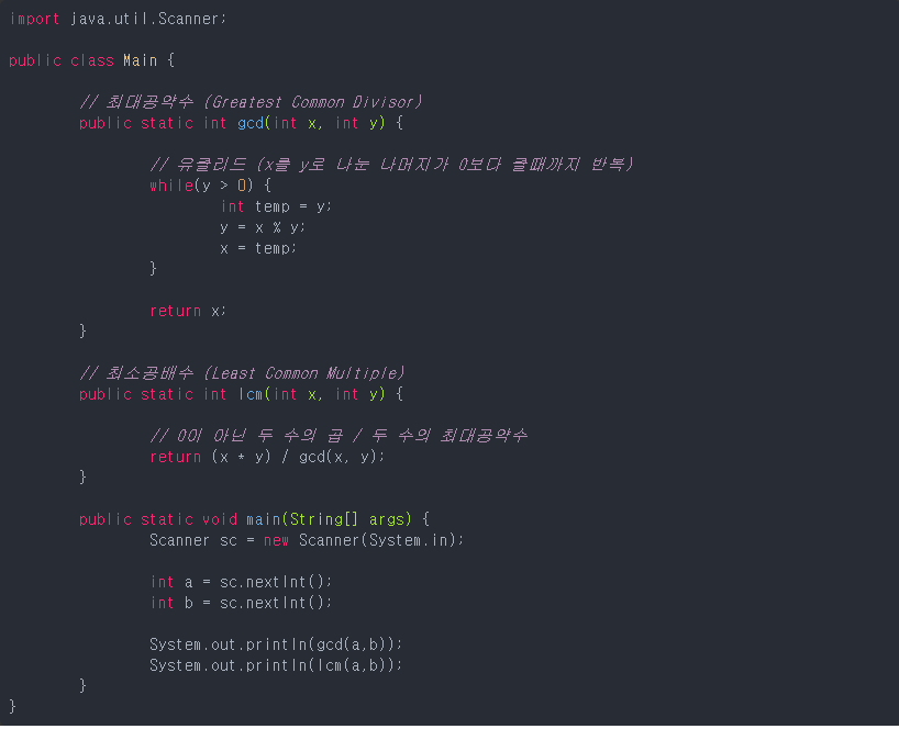 문제 소스 import java.util.Scanner; public class Main { // 최대공약수 (Greatest Common Divisor) public static int gcd(int x, int y) { // 유클리드 (x를 y로 나눈 나머지가 0보다 클때까지 반복) while(y..