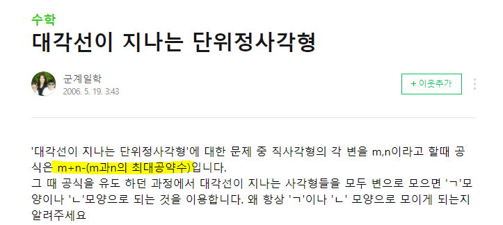 30분 정도 풀다가 사각형에서 자도 없어서 대각선 그려서 사각형 몇개 지나는지 그리거나 보기도 힘들고 기울기 방정식이나 분할해서 계산, 규칙 등 계속 볼려고 했으나 모르겠어서 바로 구글링했습니다. 허허