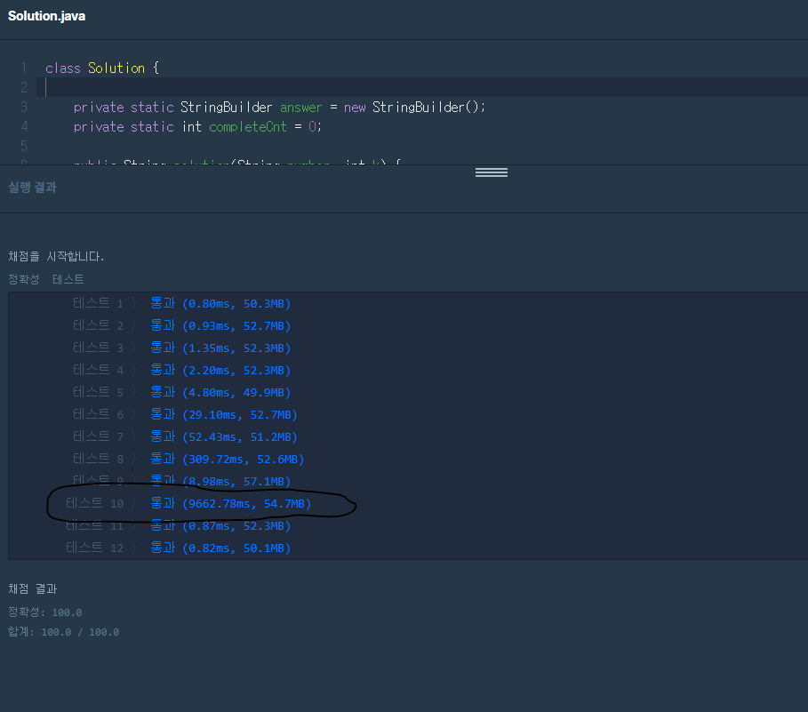 결과를 보면 알겠지만 테스트 10이 진짜 간당간당하게 통과했습니다. 원래는 틀린거지만 운으로 통과했다고 생각합니다. (주석쓰면 시간초과가 나니..)