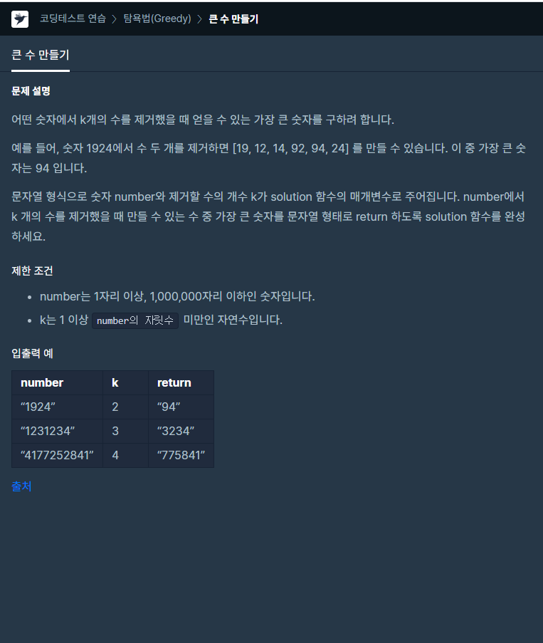 [알고리즘] 프로그래머스 큰 수 만들기 -그리디- 본문