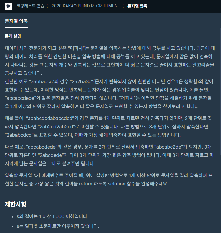 프로그래머스 프로그래머스 문자열 압축 -2020 KAKAO BLIND RECRUITMENT- 를 풀어봤습니다.