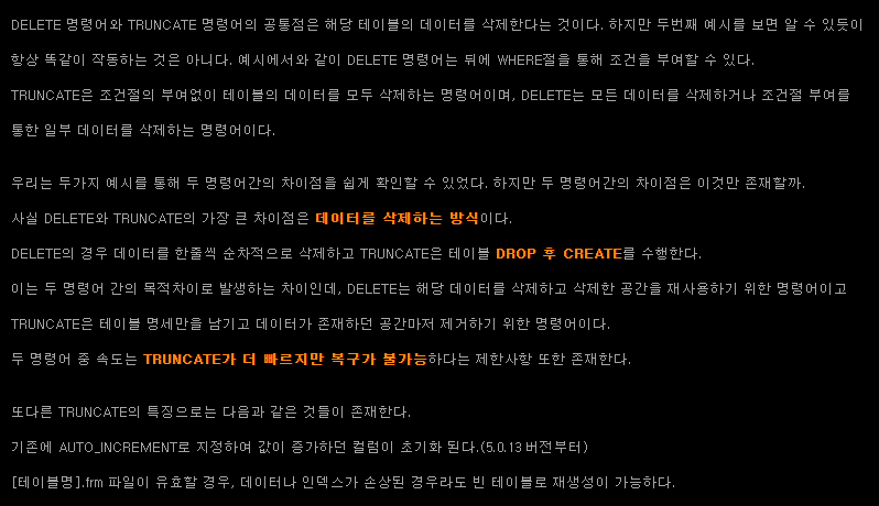 또는 TRUNCATE 명령어를 사용해주면 됩니다.