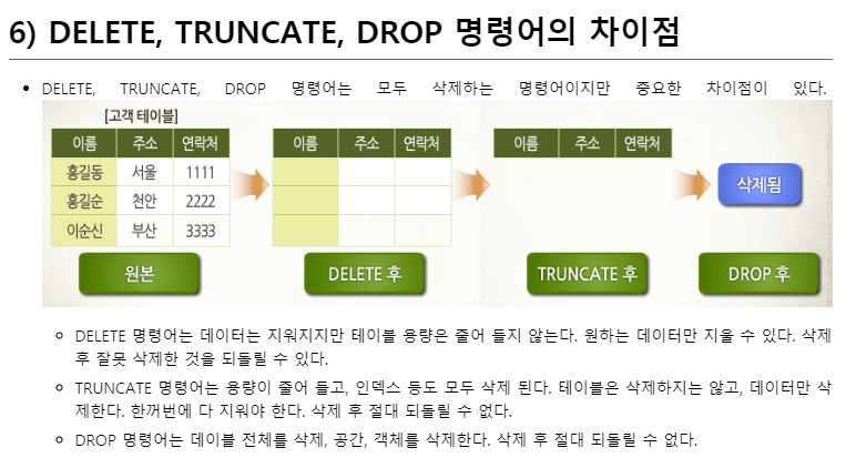 DELETE 와 TRUNCATE 의 비교를 정리하면 다음과 같습니다.