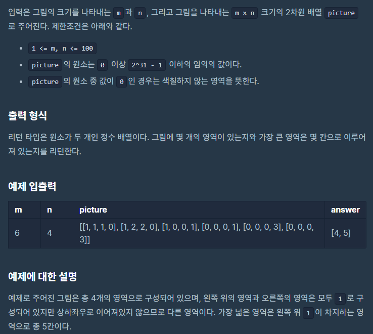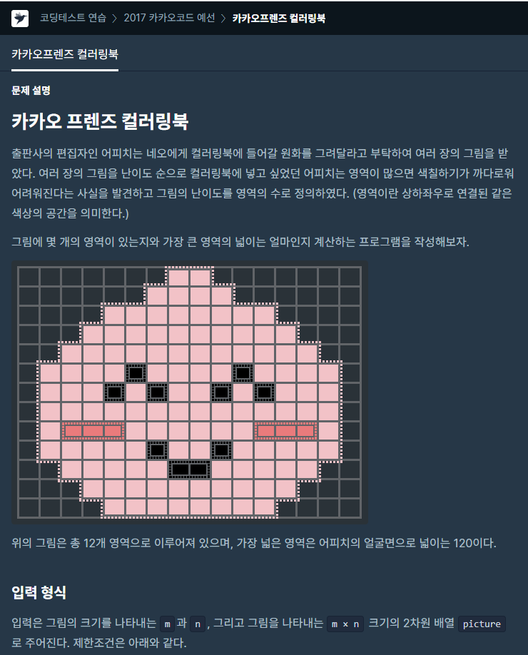 [알고리즘] 프로그래머스 카카오프렌즈 컬러링북 -2017 카카오코드 예선, bfs, dfs- 본문