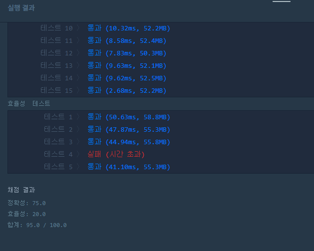 저는 리스트를 좋아해서 처음에 리스트로 변환해서 풀었는데 밑과 같이 하나에서 시간초과가 떴씁니다. ;;; 리스트 말고 배열로 풀라는 말이겠죠..