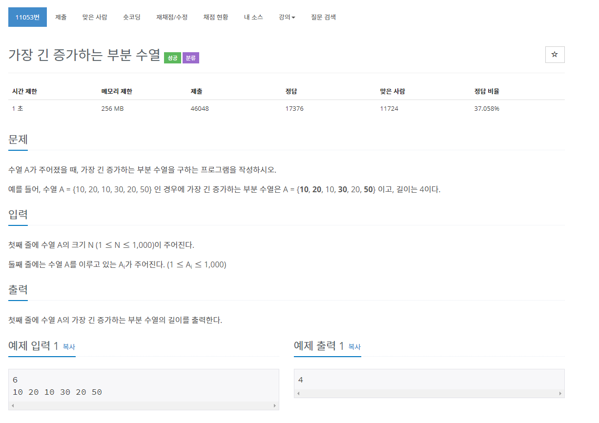 [알고리즘] 백준 11053 가장 긴 증가하는 부분 수열 -dp- 본문