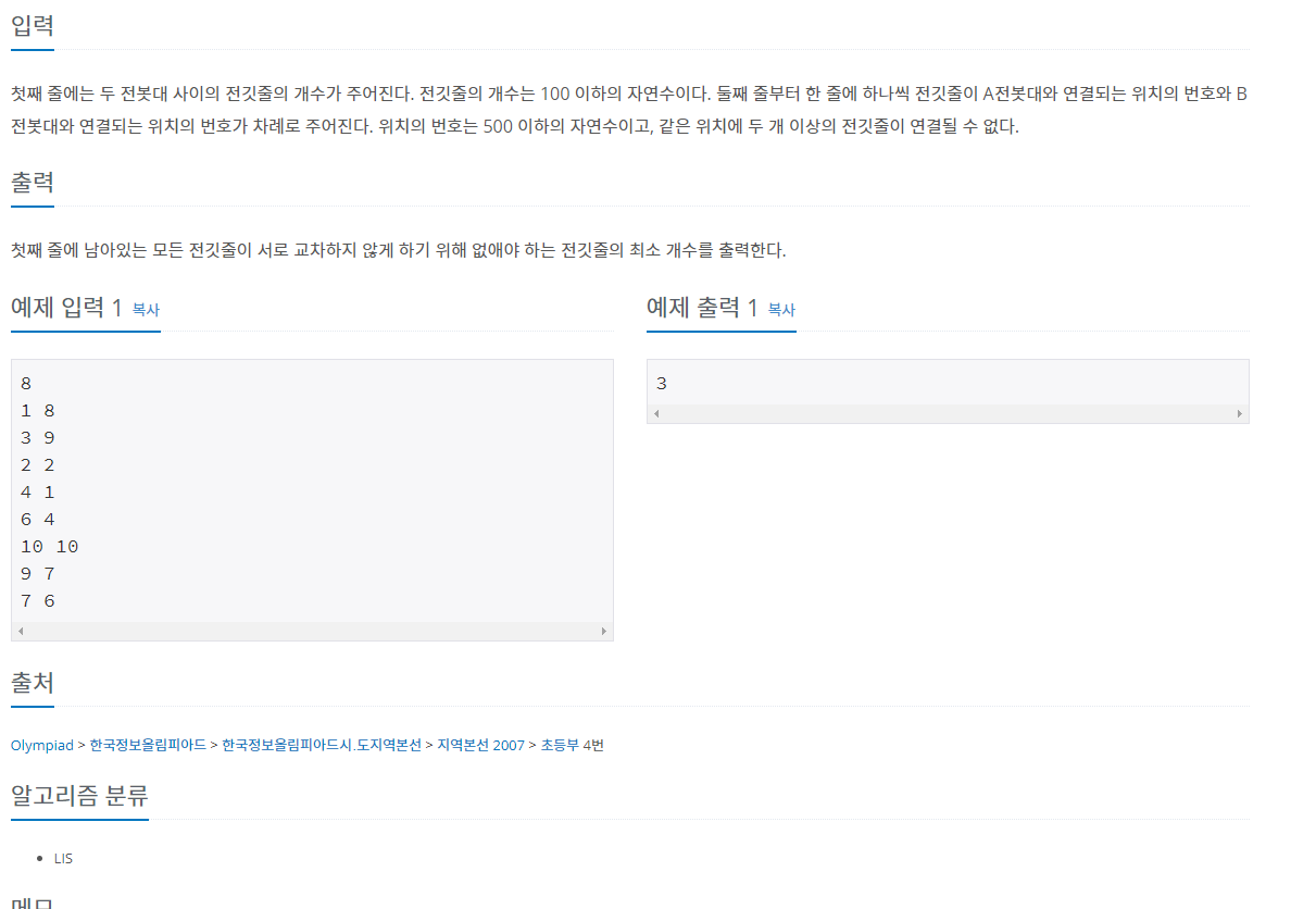 첫째 줄에는 두 전봇대 사이의 전깃줄의 개수가 주어진다. 전깃줄의 개수는 100 이하의 자연수이다. 둘째 줄부터 한 줄에 하나씩 전깃줄이 A전봇대와 연결되는 위치의 번호와 B전봇대와 연결되는 위치의 번호가 차례로 주어진다. 위치의 번호는 500 이하의 자연수이고, 같은 위치에 두 개 이상의 전깃줄이 연결될 수 없다.