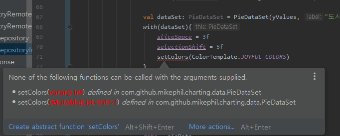 코틀린에는 없는 vararg 를 매개변수로 받게 setColors 함수는 구현되어 있는데 ColorTemplate.HOYFUL_COLORS 는 List<Int>를 반환해주었기 때문입니다. 자바라면 list를 vararg(가변인자)로 알아서 받아주는 걸로 아는데 코틀린은 그렇지 않습니다.