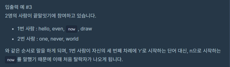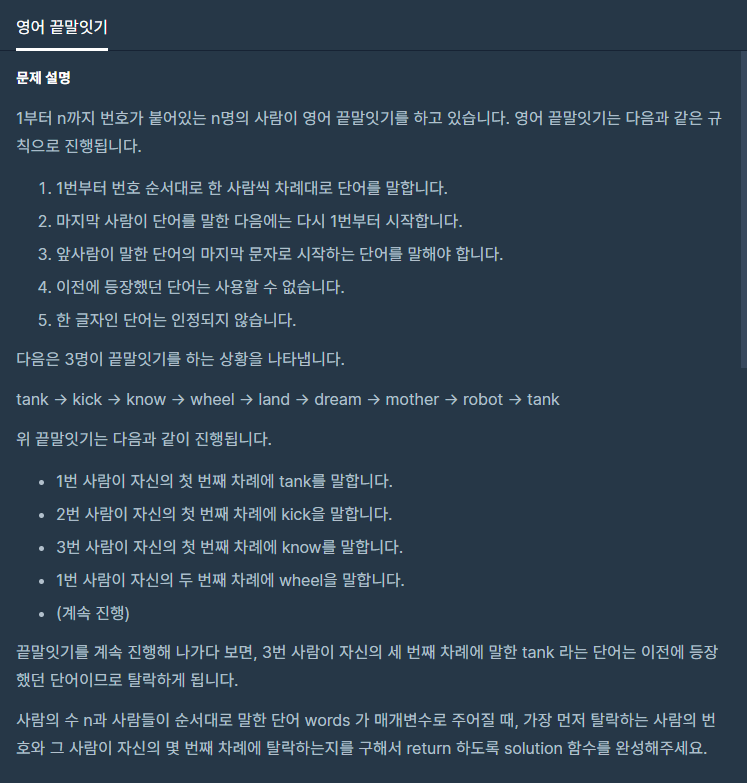 [알고리즘] 프로그래머스 영어 끝말잇기 -Summer/Winter Coding(~2018)- 본문